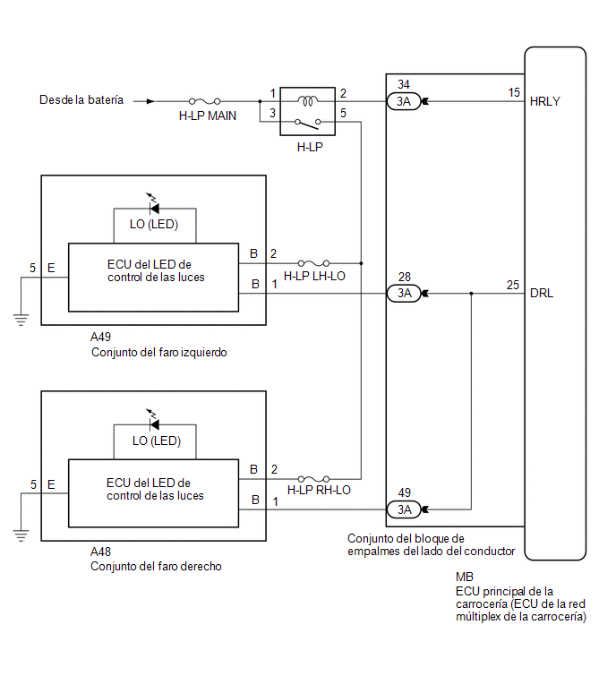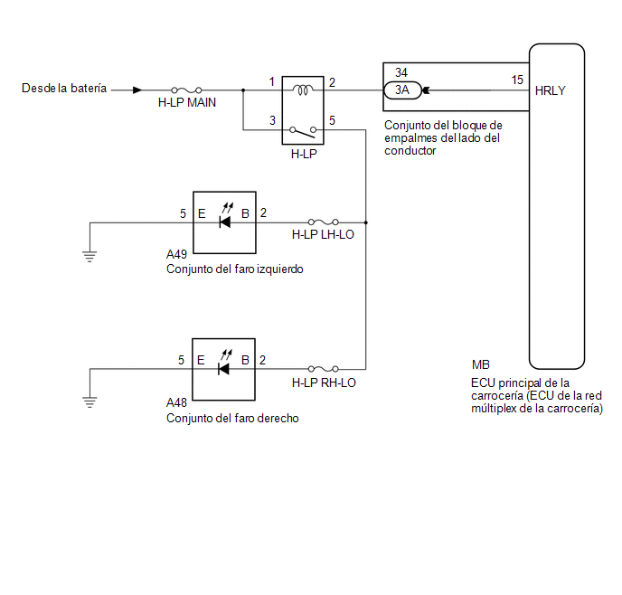 | DESCRIPCIÓN La ECU principal de la carrocería (ECU de la red múltiplex de la carrocería) controla las luces de cruce. DIAGRAMA DE CONEXIONES Para faros de un solo haz   Para faro de haz doble   PRECAUCIÓN / AVISO / OBSERVACIÓN AVISO: Inspeccione los fusibles para los circuitos relacionados con este sistema antes de realizar el siguiente procedimiento. PROCEDIMIENTO