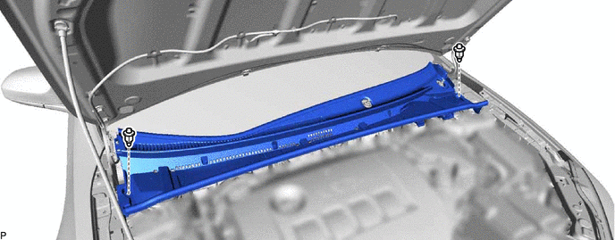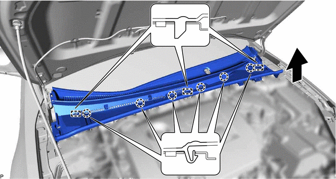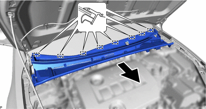 5. EXTRAIGA EL SUBCONJUNTO DE VENTILACIÓN DEL CUBRETABLEROS DERECHO OBSERVACIÓN: Siga el mismo procedimiento que en el lado izquierdo. 6. EXTRAIGA EL SUBCONJUNTO DE LA REJILLA DE VENTILACIÓN DEL PANEL SUPERIOR DEL CUBRETABLEROS (a) Quite los 2 clips. (b) Desenganche las 6 garras y las 3 guías como se muestra en la ilustración. (c) Desenganche las 8 guías y extraiga el subconjunto de la rejilla de ventilación del panel superior del cubretableros tal y como se muestra en la ilustración. 7. RETIRE EL CONJUNTO DE MOTOR Y VARILLAJE DEL LIMPIAPARABRISAS