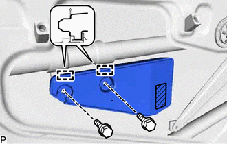 (b) Afloje el perno provisional. AVISO: No extraiga el perno provisional. Si se retira el perno provisionalmente, el conjunto del regulador de la ventanilla de la puerta trasera puede caerse y provocar daños. (c) Quite los 3 pernos. (d) Extraiga el conjunto del regulador de la ventanilla trasera. (e) Extraiga el perno provisional del conjunto del regulador de la ventanilla de la puerta trasera. 20. EXTRAIGA EL CONJUNTO DEL MOTOR DEL REGULADOR DEL ELEVALUNAS ELÉCTRICO TRASERO