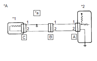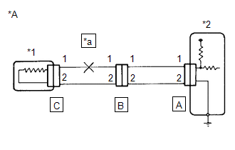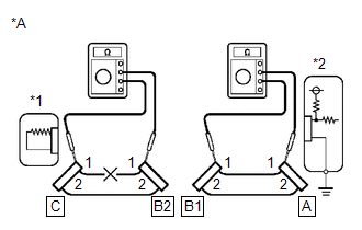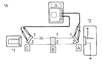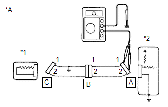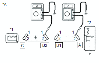 (b) Verifique la resistencia. (1) Desconecte los conectores A y C y mida la resistencia entre sus terminales. Resistencia estándar (imagen 2):