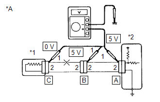 (1) Se puede averiguar si el circuito está abierto comprobando la tensión en un circuito al que se aplica tensión al terminal del conector de la ECU. Con los conectores conectados, mida la tensión entre la masa de la carrocería y los siguientes terminales (en el orden que aparece): 1) terminal 1 del conector A, 2) terminal 1 del conector B y 3) terminal 1 del conector C. Tensión estándar (imagen 4):