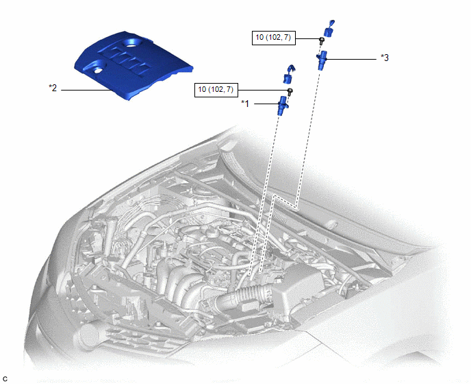 (3) Instale el sensor de posición del árbol de levas (sensor de posición de la cigüeña n° 1) en el subconjunto de la tapa de la culata con el perno. Torque: 10 N·m {102 kgf·cm, 7 ft·lbf} AVISO: