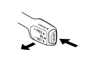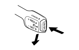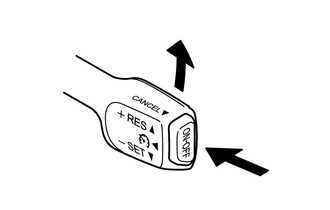 (e) Revise la función RES (RESUME). (1) Active el sistema de control de la velocidad de crucero con el interruptor principal de control de la velocidad de crucero (botón ON-OFF). (2) Conduzca a una velocidad de aproximadamente entre 40 km/h (25 mph) y 200 km/h (124 mph). (3) Coloque el interruptor principal de control de la velocidad de crucero en la posición -SET. (4) Cancele el sistema de control de la velocidad de crucero mediante cualquiera de los procedimientos anteriores (excepto apagando el sistema de control de la velocidad de crucero mediante el interruptor principal de control de la velocidad de crucero (botón ON-OFF)). (5) Tras colocar el interruptor principal de control de la velocidad de crucero en +/RES con una velocidad superior a 40 km/h (25 mph), verifique si el vehículo vuelve a circular a la velocidad fijada antes de la anulación. |