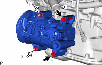 (b) Coloque el compresor y el embrague magnético con los 2 pernos y las 2 tuercas. Torque: 25 N·m {255 kgf·cm, 18 ft·lbf} OBSERVACIÓN: Para instalar el compresor y el embrague magnético, apriete los pernos y las tuercas en el orden indicado en la ilustración.