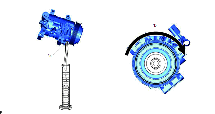 (e) Drene la cantidad siguiente de aceite del compresor del orificio para el aceite del nuevo compresor y embrague magnético como se muestra en la ilustración. Estándar: (La cantidad de aceite del nuevo compresor y embrague magnético: 70 cm3 (2.37 fl.oz.)) - (cantidad de aceite del compresor y embrague magnético extraídos) = la cantidad de aceite a retirar del nuevo compresor y el embrague magnético. AVISO: