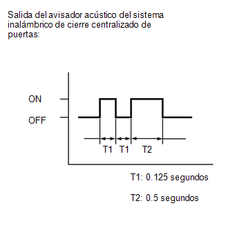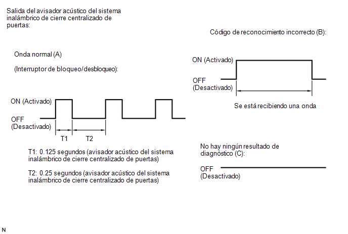 (g) Compruebe los resultados del diagnóstico cuando se pulsa un interruptor del subconjunto del transmisor de la llave eléctrica. Los resultados del diagnóstico se pueden comprobar mediante el modo del avisador acústico del sistema inalámbrico del cierre centralizado de puertas. Resultado