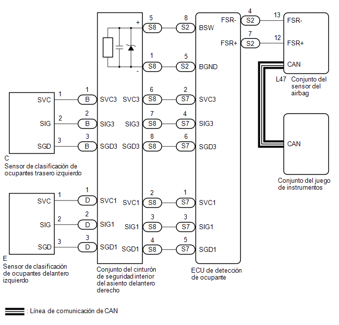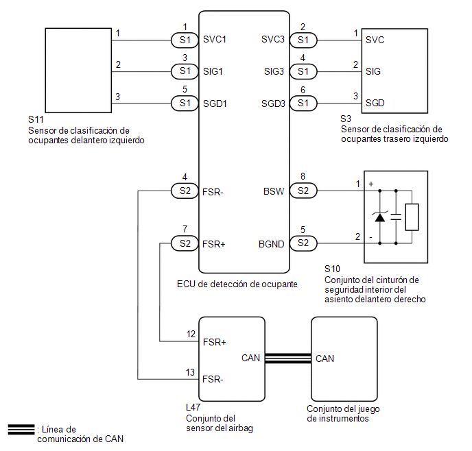 DESCRIPCIÓN Al girar el interruptor de encendido a ON, la ECU de detección de ocupantes envía señales al conjunto del sensor del airbag para indicar el estado del conjunto del cinturón de seguridad interior del asiento delantero derecho y también si el asiento del pasajero delantero está ocupado. El conjunto del sensor del airbag envía las señales al conjunto del juego de instrumentos a través de la comunicación CAN. El conjunto del juego de instrumentos enciende, se apaga o hace parpadear el indicador de advertencia del cinturón de seguridad en el conjunto del juego de instrumentos de acuerdo con estas señales. DIAGRAMA DE CONEXIONES Fabricados por TMMMS