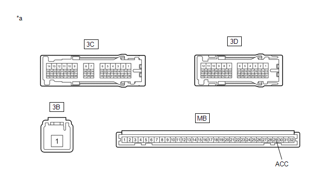 (a) Desconecte los conectores 3B, 3C y 3D del conjunto del bloque de empalmes del lado del conductor. (b) Mida la tensión según los valores de la siguiente tabla. Tensión estándar:
