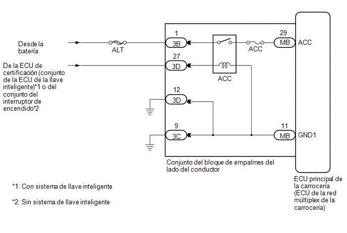 DESCRIPCIÓN Este circuito detecta el estado ACC u OFF del interruptor de encendido y envía la información a la ECU principal de la carrocería (ECU de la red múltiplex de la carrocería). DIAGRAMA DE CONEXIONES