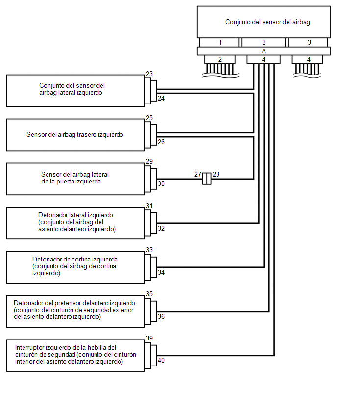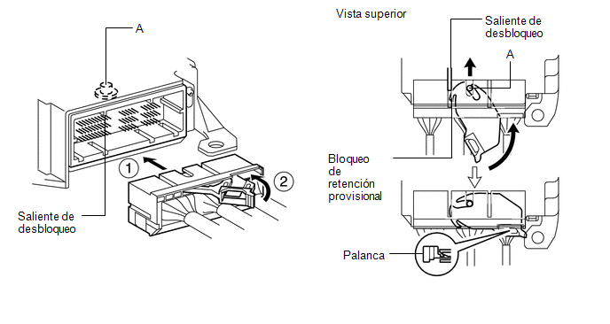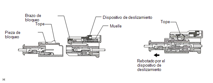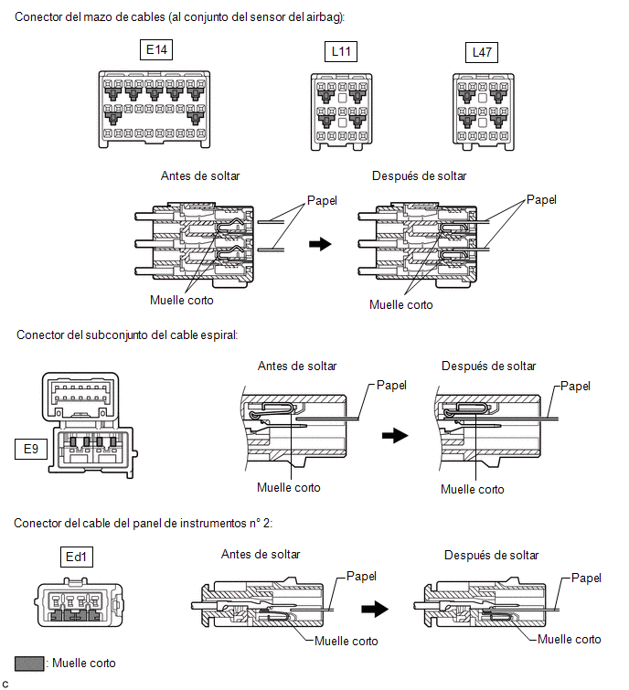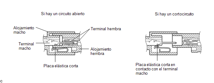 (1) Este mecanismo está diseñado para impedir que el conector se conecte solo a mitad de su recorrido. (2) Al conectar el soporte al conjunto del sensor del airbag, el saliente de desbloqueo desbloquea el bloqueo de retención provisional, lo cual permite que la palanca sea presionada girando alrededor del eje A. (3) Al bloquear la palanca en el soporte, se bloquea el soporte firmemente. MECANISMO DE PREVENCIÓN DE ACTIVACIÓN (a) Función del mecanismo de prevención de activación (1) El conector del circuito del detonador del sistema de airbag tiene integrado un mecanismo de prevención de activación para prevenir la activación accidental del airbag y el pretensor. (2) Cuando se desconecta el conector, este mecanismo cierra el circuito poniendo el muelle corto en contacto con los terminales y aislando el circuito de alimentación externo para evitar que el airbag y el pretensor se activen accidentalmente. (b) Liberación del mecanismo de prevención de activación (1) Para liberar el mecanismo de prevención de activación, introduzca un trozo de papel del mismo grosor que el terminal macho (aproximadamente 0.5 mm (0.0197 pulg.)) entre los terminales y el muelle corto, para interrumpir la conexión entre ambos. (2) Observe las siguientes ilustraciones sobre cómo los conectores utilizan el mecanismo de prevención de activación y los métodos para liberarlo. ADVERTENCIA: Nunca libere el mecanismo de prevención de activación en el conector del detonador, ni siquiera cuando se realice una inspección con el detonador desconectado. AVISO: