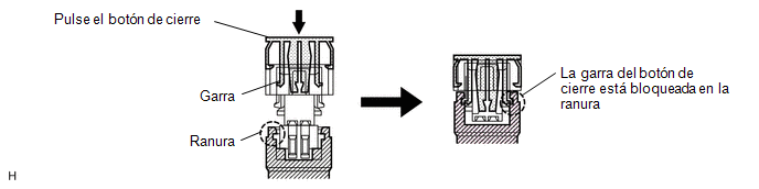 (1) Este mecanismo se ha diseñado para evitar que el conector se desconecte accidentalmente. (2) Si se bloquea el botón de bloqueo del conector, la garra del botón de cierre se engancha en las ranuras del otro lado del conector de forma que este quede fijado con seguridad. (f) Mecanismo de seguridad de la posición del conector (CPA)