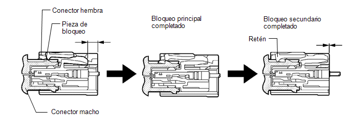 (1) Este mecanismo está diseñado para detectar cuando el conector está conectado solo a mitad de su recorrido. (2) El CPA y el conector hembra se desplazan hacia el lado del conector marcho al mismo tiempo y el bloqueo principal finaliza cuando el conector hembra se engancha con el conector macho. En este punto, únicamente el CPA se desplaza hacia el lado del conector macho y el bloqueo secundario finaliza cuando el retén del CPA se engancha con el conector hembra. Cuando los extremos del CPA y el conector hembra queden alineados, están completamente enganchados. (g) Mecanismo de bloqueo de conectores (2)