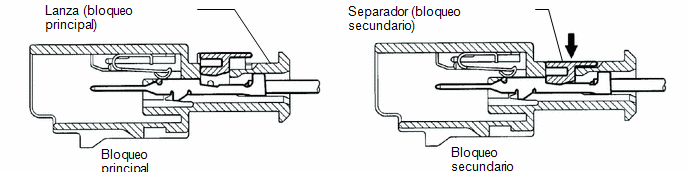 (1) Este mecanismo está diseñado para aumentar la capacidad del terminal a permanecer conectado y evitar que se desconecte accidentalmente. (2) El conector tiene una estructura de dos piezas que consta del alojamiento y el separador para bloquear el terminal de forma segura usando tanto la lanza (bloqueo principal) como el separador (bloqueo secundario). (c) Mecanismo de prevención de conexión deficiente