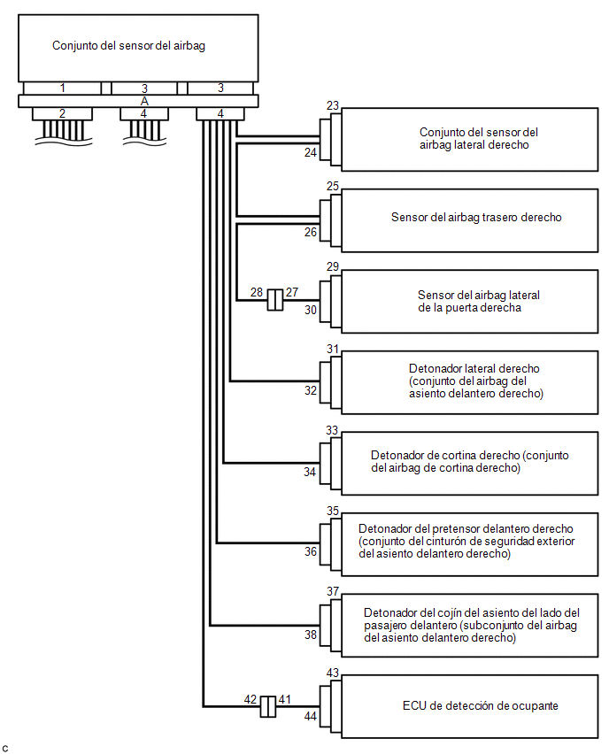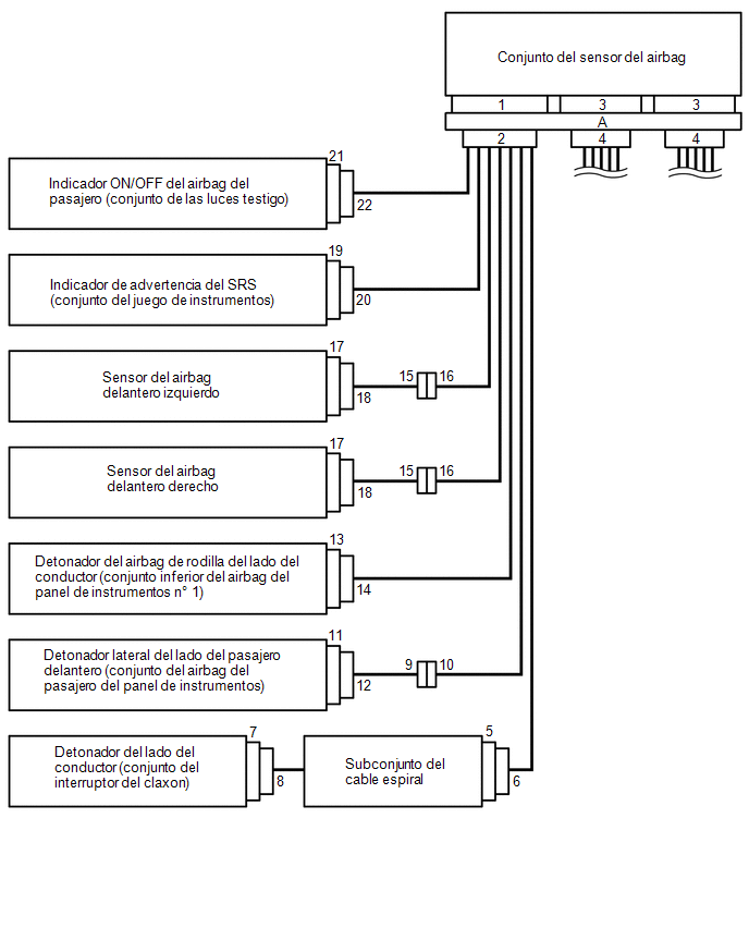(b) Compruebe que el indicador ON/OFF del airbag del pasajero ("ON" y "OFF") se enciende durante 4 segundos aproximadamente y luego se apaga durante unos 2 segundos. OBSERVACIÓN: Consulte la tabla de funcionamiento del indicador del paso anterior relativa al indicador ON/OFF del airbag del pasajero cuando se coloca el interruptor de encendido en la posición ON y han transcurrido unos 6 segundos. FUNCIÓN DE LOS CONECTORES DEL AIRBAG (a) En la ilustración se indica la ubicación de los conectores del SRS.