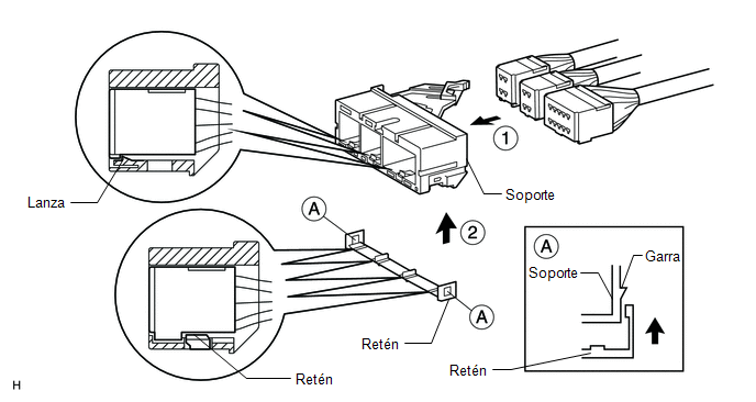 (1) Este mecanismo se ha diseñado para evitar que el conector se desconecte accidentalmente. (2) Deslice el conector hasta el fondo en el soporte y al bloquear la lanza finaliza el bloqueo principal. (3) Al enganchar el retén en el soporte tal y como se muestra en la ilustración finaliza el bloqueo secundario, que evita que el conector se desconecte accidentalmente. (h) Mecanismo de bloqueo de prevención de conexión incorrecta