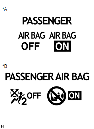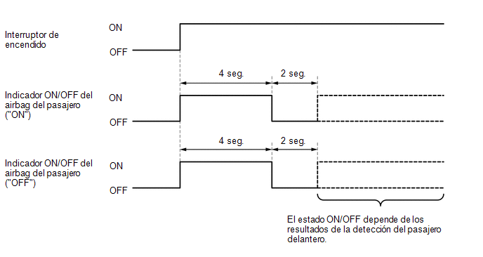FUNCIÓN DEL INDICADOR DE CONEXIÓN/DESCONEXIÓN DEL AIRBAG DEL PASAJERO (a) Inspección inicial (1) Coloque el interruptor de encendido en posición ON. (2) El indicador ON / OFF del airbag del pasajero se enciende 4 segundos y luego se apaga aproximadamente 2 segundos. (3) Unos 6 segundos después de colocar el interruptor de encendido en posición ON, el indicador ON/OFF del airbag del pasajero señalará ON/OFF en función de las condiciones que se enumeran a continuación. Funcionamiento del indicador