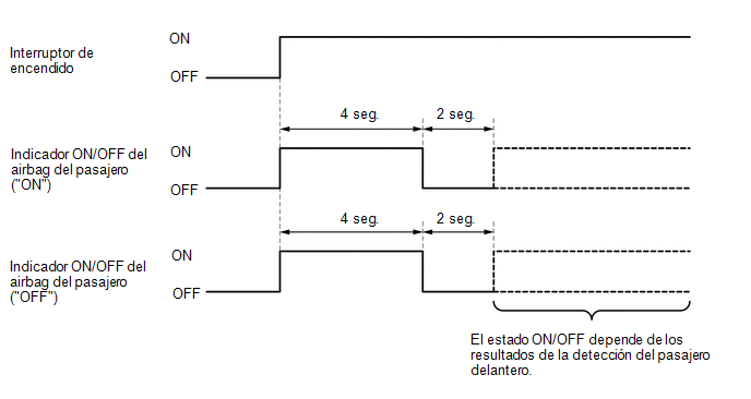 SISTEMA DE DIAGNÓSTICO REVISE EL DLC3 (a) Inspeccione el DLC3. Haga clic aquí FUNCIÓN DEL INDICADOR DE CONEXIÓN/DESCONEXIÓN DEL AIRBAG DEL PASAJERO (a) Inspección inicial (1) Coloque el interruptor de encendido en posición ON. (2) El indicador ON / OFF del airbag del pasajero se enciende 4 segundos y luego se apaga aproximadamente 2 segundos. (3) Unos 6 segundos después de colocar el interruptor de encendido en posición ON, el indicador ON/OFF del airbag del pasajero señalará ON/OFF en función de las condiciones que se enumeran a continuación. Funcionamiento del indicador